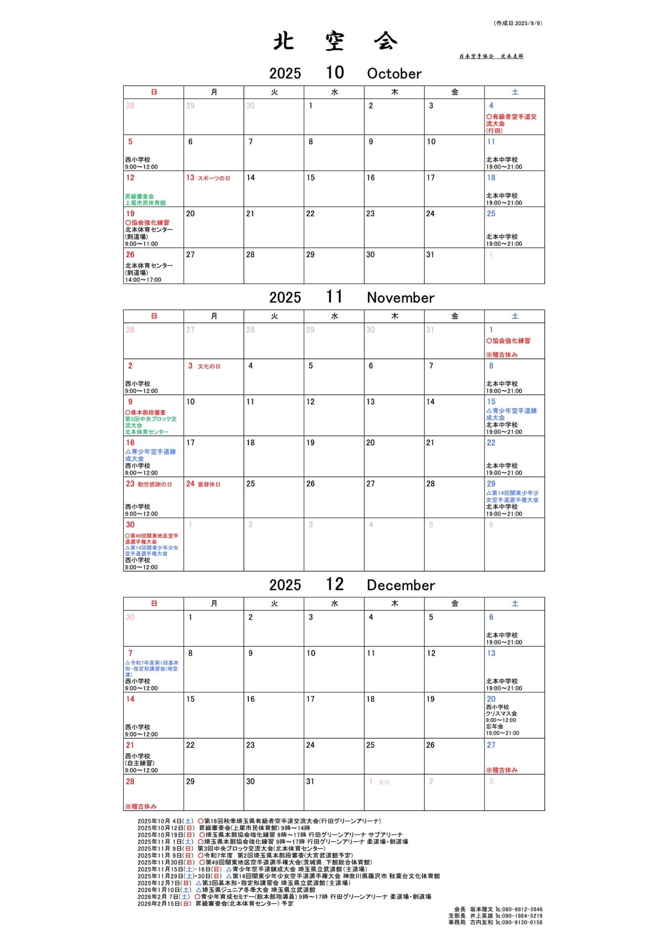 北本支部 北空会の稽古予定表