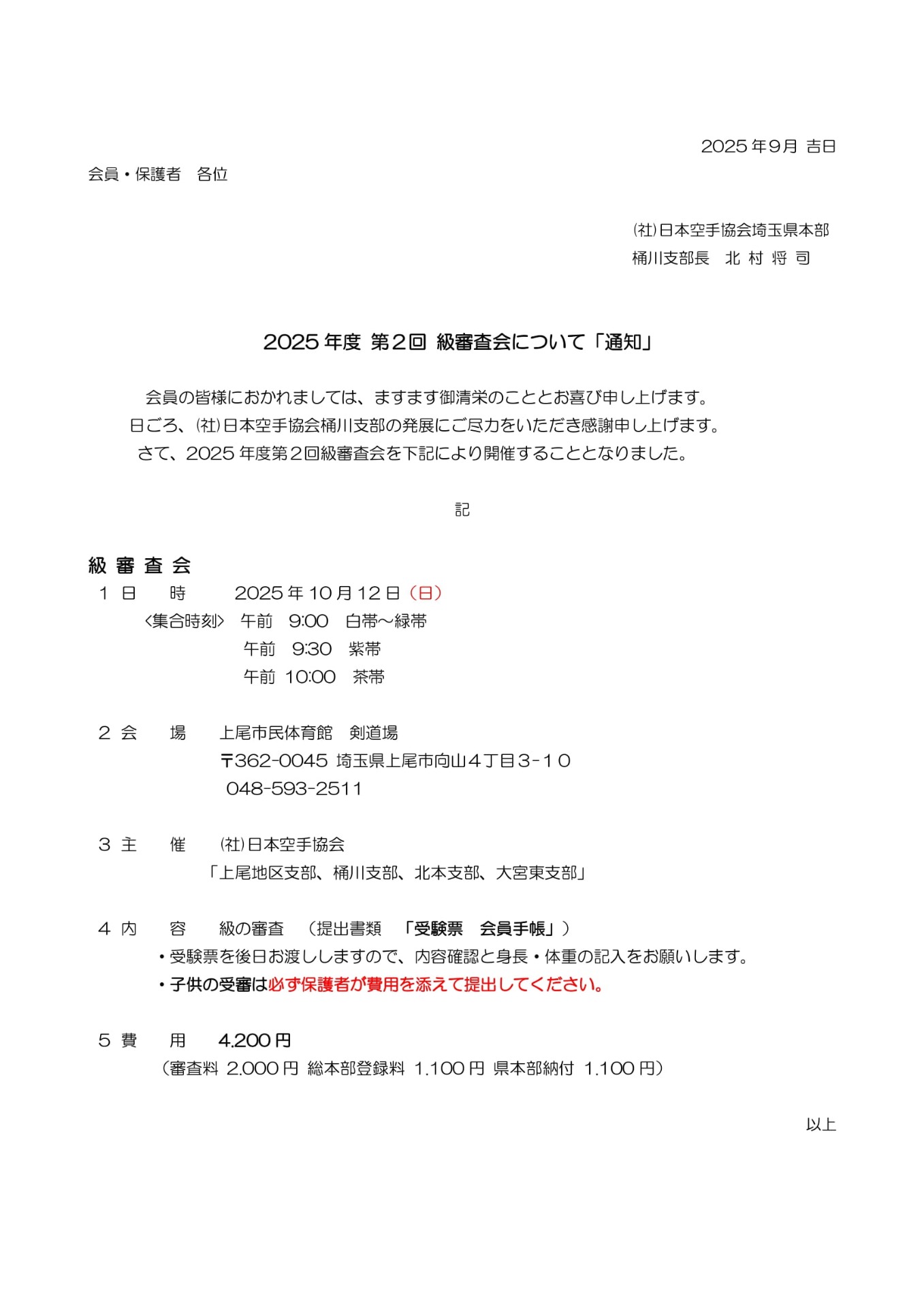 この他に熱中症対策を含めて、桶川空手愛好会のルールを以下のように定義いたしますので、