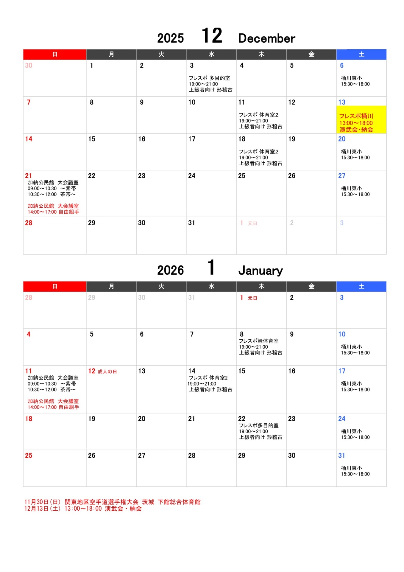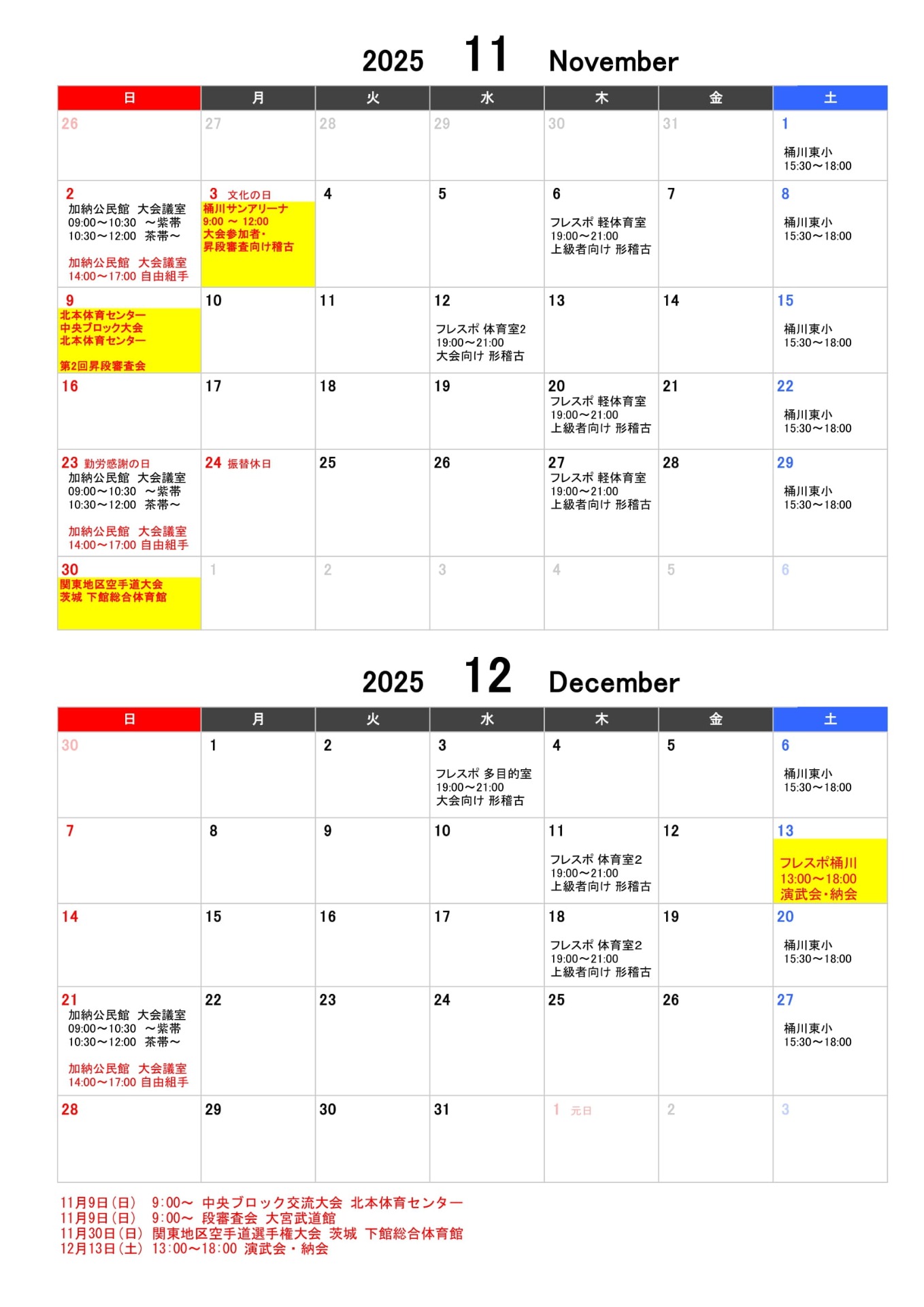 <桶川支部 稽古予定表>