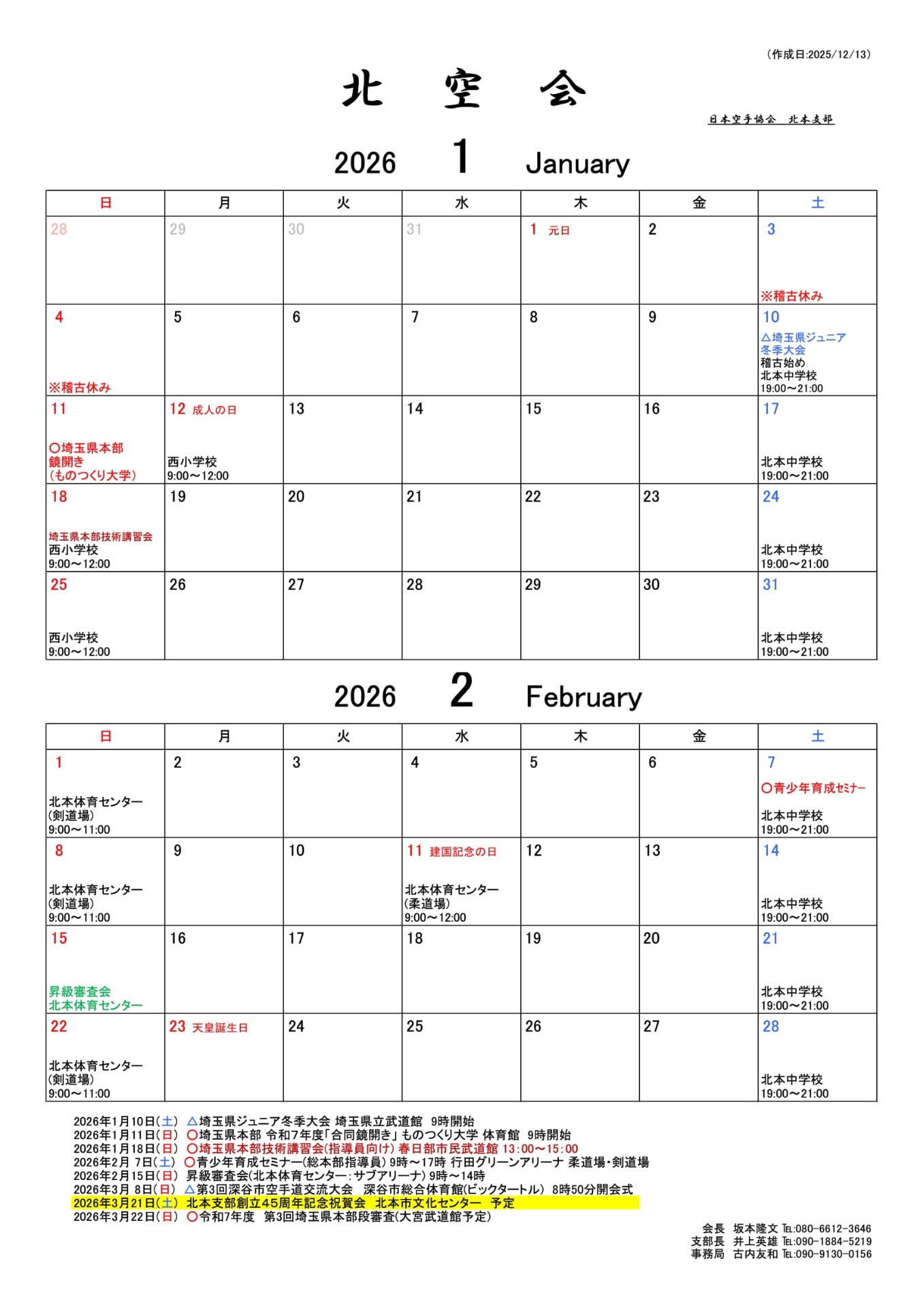 北本支部 北空会の稽古予定表