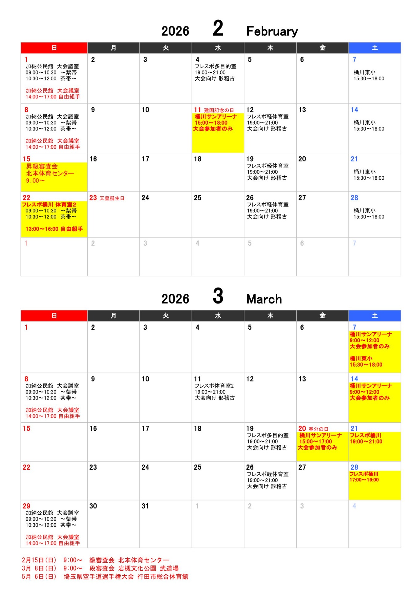 <桶川支部 稽古予定表>